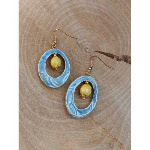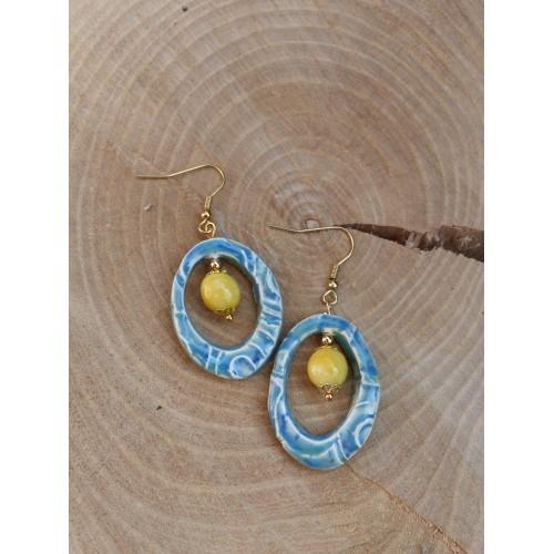 Elles sont composées d'un oval de porcelaine texturée de 5mm d'épaisseur, à l'émail bleu moucheté, tournant autour du crochet, et d'une perle jaune.