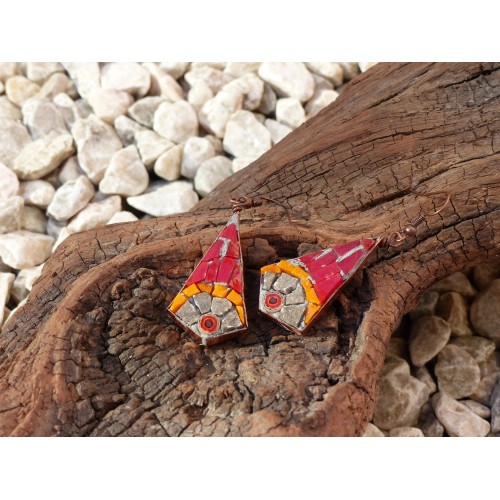 Boucle d'oreille en mosaique de marbre et verre grenat et orange sur cuivre